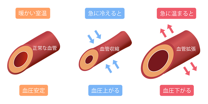 例えば入浴時に寒い脱衣所から熱い浴槽に入ると、血圧が急激に上昇・下降し、体がその変化に耐えられなくなります。